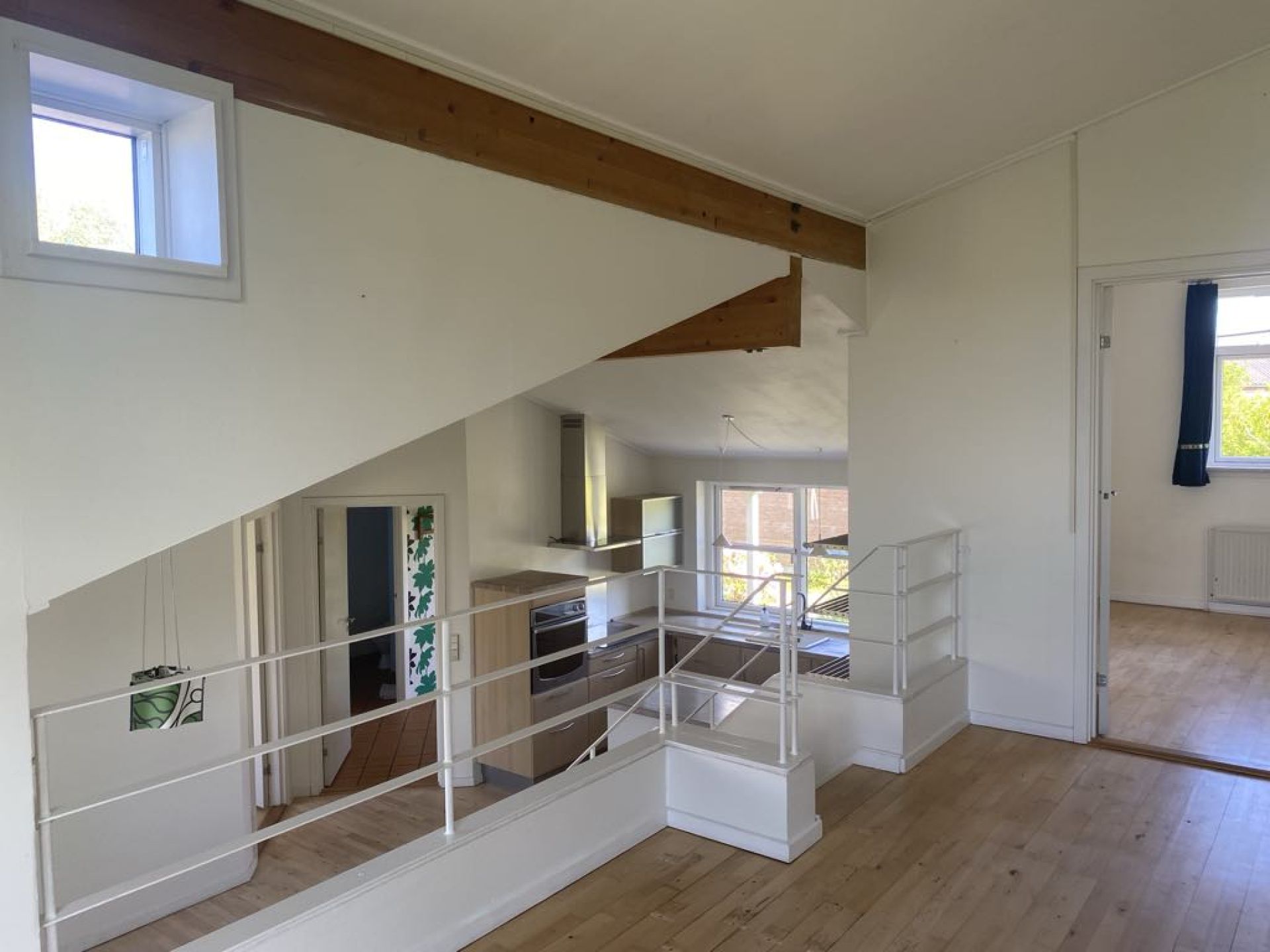 ½ niveau op i åben forbindelse med køkken/alrum findes stue, samt et stort værelse. Fra stueplan er der et ½ niveau ned en stor tør opholdskælder, der er indrettet med 2 værelser, som typisk anvendes til værelse, gæsteværelse, hobbyrum eller lignende.