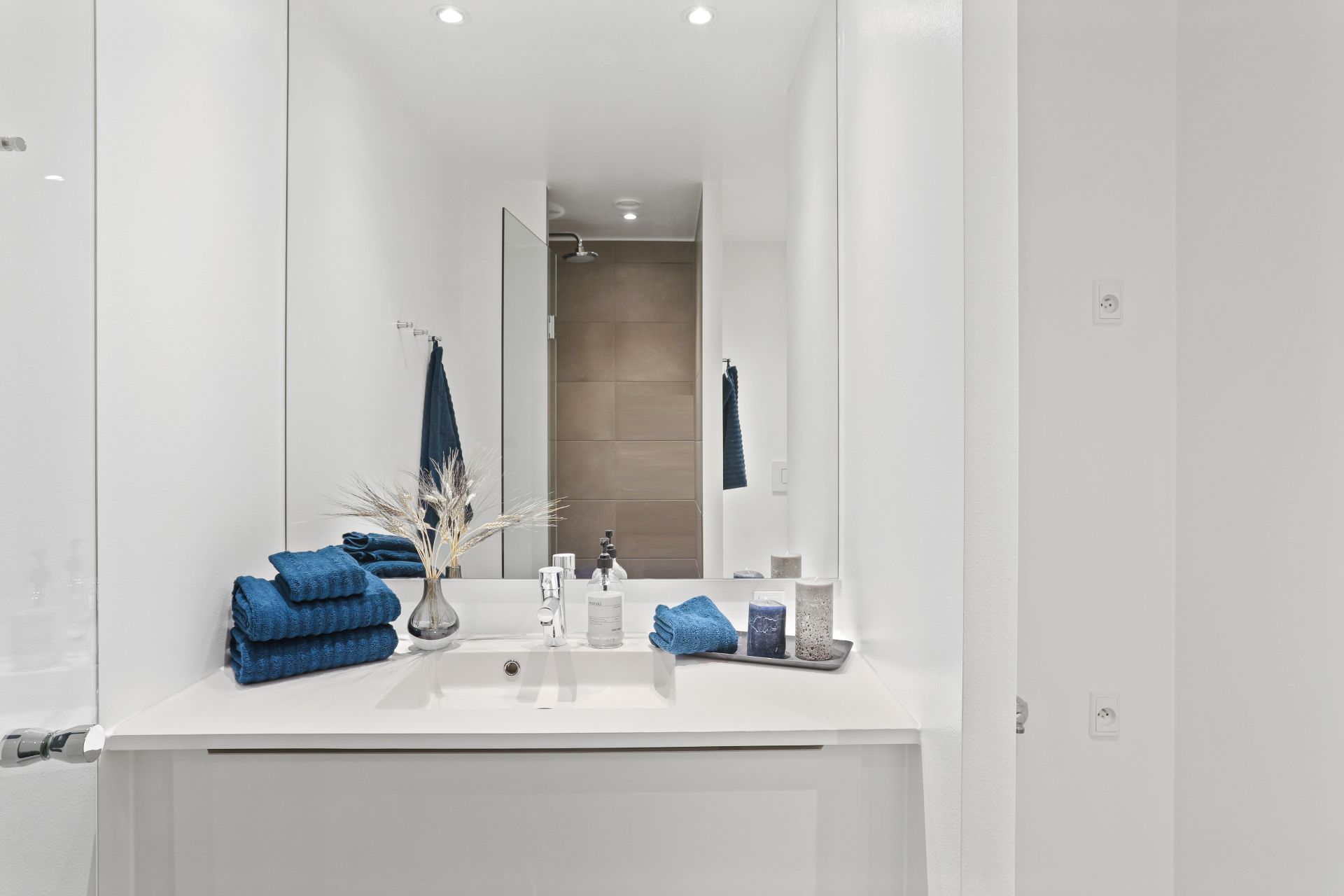 Lejligheden indeholder: Entré med skabe fra Invita og adgang til et flot badeværelse med brus, skuffer under håndvasken og plads til egen vask/tør. (gratis fællesvaskeri findes på 3. sal) Hvidt stilfuldt køkken fra Invita med en stål-bordplade og alle hårde hvidevarer. Ved køkkenet er der plads til spisebordet i et dejligt lys fra de store vinduespartier. Hyggelig stue og derfra adgang til soveværelset med skabe.